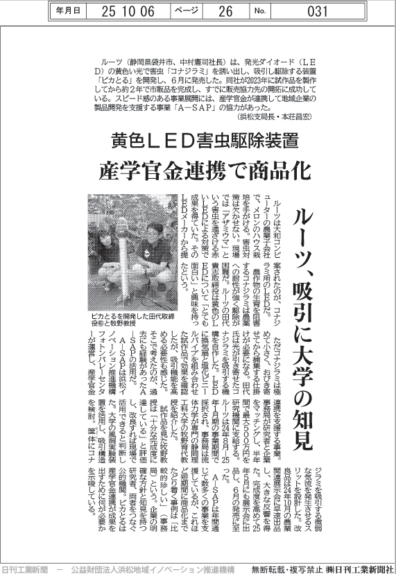 A-SAP事業成果 LED誘引駆除機『ピカとる™』 —が日刊工業新聞に掲載されました